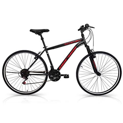 Ecco un’altra bicicletta da passeggio con telaio in lega d’acciaio, ruote da 28″ e sistema frenante V-brake. Questa volta però l’anima è più sportiva, come dimostra l’assenza del portapacchi posteriore, che però può essere installato in un secondo momento. Stesso discorso vale per le luci, il cavalletto e i parafanghi. La bici da città Geroni TRX 50 è adatta anche per i sentieri di montagna, con piccole rocce e terriccio, ed è dotata di una struttura Steel che permette di produrre pedalate ad alte prestazioni. I comandi MicroShift a 21 velocità consentono di adattarsi al meglio a tutte le superfici. Il telaio ha una forma innovativa, con una speciale curvatura nella parte superiore del tubo obliquo, e un tipo di vernice resistente all’azione degli agenti atmosferici.