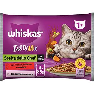 Whiskas Tasty Mix Scelta dello Chef - Cibo Umido Completo per Gatti Adulto, 4 Bustine da 85g con Manzo, Pollame, Salmone e Verdure