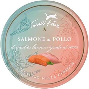Terra Felis Cibo Umido per Gatti Salmone e Pollo 80g - Alimento Completo con 90% Pesce e Carne, Senza Cereali