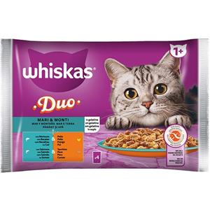 Whiskas Duo Mari & Monti - Alimento Umido Completo per Gatti in Gelatina, 4 x 85 gr con Doppia Proteina di Merluzzo e Pollo, Salmone e Tacchino