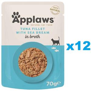 Applaws Alimento Umido per Gatti Adulto - Filetto di Tonno e Orata in Brodo, 12 Buste da 70g, 100% Naturale e Senza Additivi