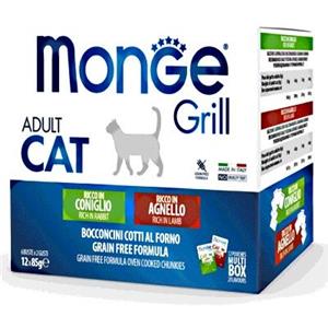 Monge Grill Adult Cat Multipack - Cibo Umido per Gatti - 12 Buste da 85 g (Coniglio e Agnello) - Grain Free e Ricco in Omega 3