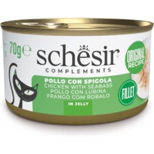 Schesir Complements Cibo Umido per Gatti Adulto - Filetti di Pollo con Spigola in Gelatina - 12 Lattine da 70g