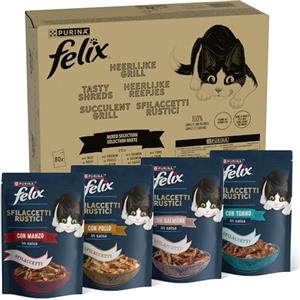 Felix Sfilaccetti Rustici - Cibo Umido per Gatti con Manzo, Pollo, Salmone e Tonno, 80 buste da 80g, Senza Coloranti e Conservanti