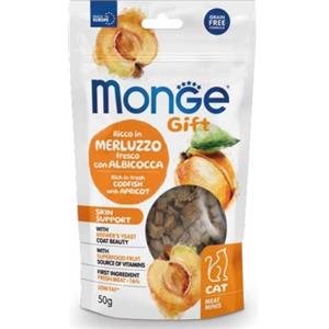 Monge Gift Snack Gatto Meat Minis Skin Support 50g - Merluzzo Fresco e Albicocca, Alimento Complementare per Gatti Adulti