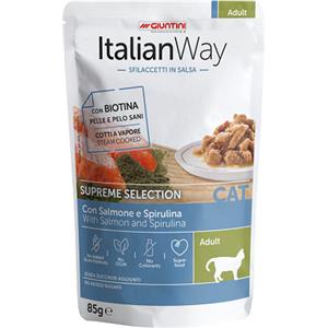 Italian Way Sfilaccetti in Salsa per Gatti Adulti - Gusto Salmone e Spirulina, Cotti a Vapore, Grain Free