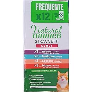 Natural Trainer Straccetti Umido per Gatti Adulti - Multipack 12 bustine (Manzo, Salmone, Anatra, Merluzzo) - Cibo Completo e Naturale