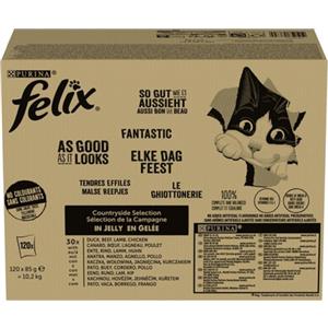 Felix Fantastic Cibo Umido per Gatti Adulti in Gelatina - Assortimento Anatra, Bue, Agnello e Pollo, Confezione da 120 Buste da 85 g