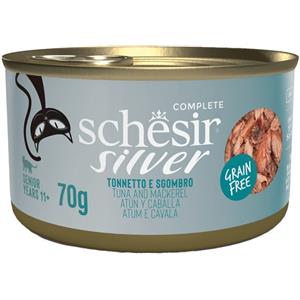 Schesir Silver Senior Cat Cibo Umido Tonno e Sgombro - Lattina da 70 g per Gatti dai 11 Anni