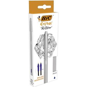 BIC Cristal Re'New - Penna a Sfera Ricaricabile Blu 1mm, Fusto in Metallo, Cappuccio in Plastica Riciclata, Confezione con 2 Ricariche