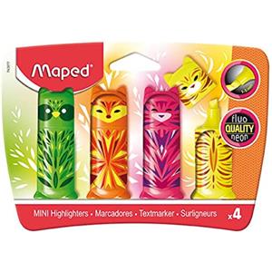 Maped Mini Friends - Mini evidenziatori fluo con punta scalpello e fantasie di animali, confezione da 4 colori assortiti
