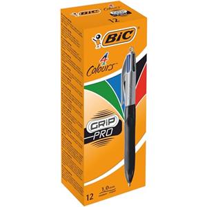 BIC 4Colori Grip Pro - Penna a Sfera a Scatto, Punta Media (1.0 mm), Confezione da 12, Colori: Nero, Blu, Verde, Rosso