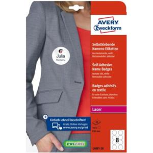 Avery Badge Adesivi per Tessuti Ø 65 mm - 160 Etichette Rimovibili per Stampanti Laser, Confezione da 20 Fogli