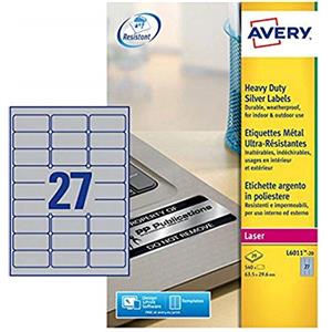 Avery L6011-20 Etichette Adesive in Poliestere Argento Permanenti 63,5 x 29,6 mm - Confezione da 20 Fogli A4