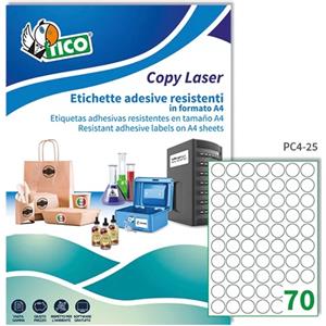 Tico Etichette Adesive Trasparenti in Poliestere - 100 Fogli A4, 70 Etichette per Foglio, Diametro 25 mm, Adesivo Permanente, Compatibili con Stampanti Laser