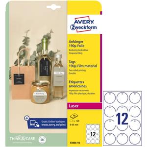 Avery Cartellini Ultraresistenti in Plastica 190µ Ø60mm - 12 Cartellini per Foglio, Stampa Laser Fronte e Retro, Cordoncini Inclusi, Confezione da 10 Fogli