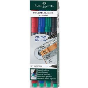 Faber-Castell Multimark Marcatore Permanente con Gomma - 4 Colori Assortiti (Nero, Blu, Verde, Rosso) - Punta Fine 0,6 mm