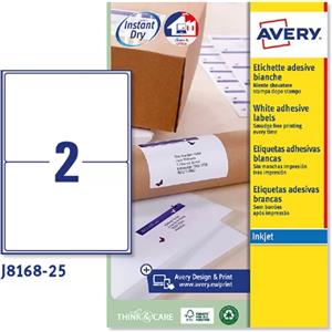 Avery Etichette Adesive Bianche J8168-25 - 199,6 x 143,5 mm - 2 Etichette per Foglio - 25 Fogli - Inkjet - QuickDRY™