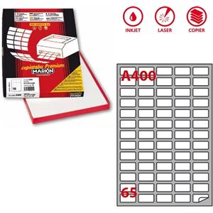 Markin Etichette Adesive A400 Bianche - 38,1 x 21,2 mm - Angoli Arrotondati - Collante Permanente - 65 Etichette per Foglio - Confezione da 100 Fogli A4 - 6500 Etichette Totali
