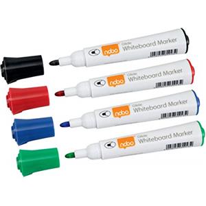 Nobo Pennarelli per Lavagna Bianca a Inchiostro Liquido Cancellabili a Secco, Punta Tonda Larga 3 mm, Confezione da 4, Colori Assortiti, Cod. 1902408