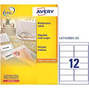 Avery Etichette Bianche Rimovibili - 99,1 x 42,3 mm - 12 Etichette per Foglio - Confezione da 25 Fogli - Compatibili con Stampanti Laser e Inkjet
