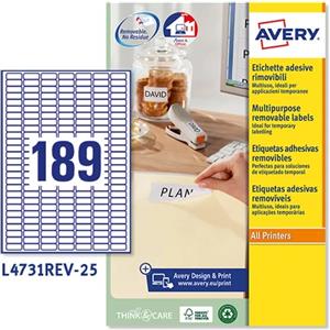 Avery Etichette Bianche Rimovibili - 25,4 x 10 mm - 189 Etichette per Foglio - Formato A4