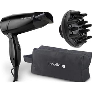 Innoliving Asciugacapelli Pieghevole INN-618 1600 W con Diffusore, Custodia, 2 Velocità e Tasto Aria Fredda - Nero