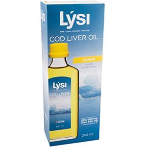 LYSI Olio di fegato di merluzzo liquido al limone LYSI dall'Islanda. Flacone vetro da 240. Olio di pesce di tipo trigliceride di grado farmaceutico, al gusto di limone, senza retrogusto di pesce.
