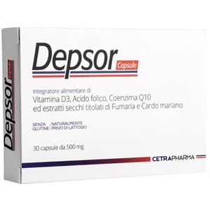 Cetra Pharma Depsor - Integratore alimentare con Vitamina D3, Acido folico, Coenzima Q10 e estratti di Fumaria e Cardo mariano - 30 Capsule da 500 mg