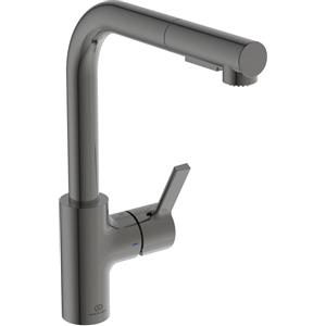 Ideal Standard Gusto - Miscelatore monocomando per lavello da cucina con bocca ad L tubolare, doccetta estraibile a due funzioni e risparmio energetico BlueStart, Magnetic Grey