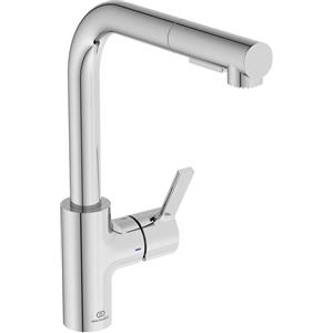 Ideal Standard Gusto - Miscelatore monocomando per lavello da cucina con bocca ad L tubolare, doccetta estraibile a due funzioni e sistema di risparmio energetico