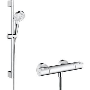 Hansgrohe Crometta Sistema Doccia Esterno Vario con Termostatico Ecostat 1001 CL e Asta Doccia 65 cm, Bianco/Cromo, Soffione 100 mm con Getti Rain e IntenseRain