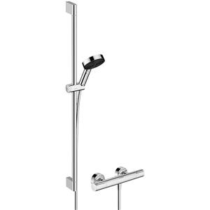 Hansgrohe Pulsify Select S - Set doccia con termostatico Ecostat Element, doccetta EcoSmart 105 mm con 3 getti, tubo flessibile e asta doccia 0,9 m, cromo
