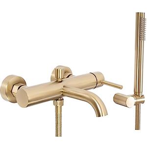 Rea Rubinetto Vasca Lungo Brush Gold - Miscelatore in Ottone con Doccetta, Montaggio a Parete, Colore Oro Spazzolato