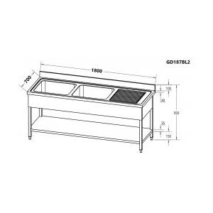 FIMAR GD187BL2 Lavello aperto in acciaio inox AISI 304 con 2 vasche a sinistra e ripiano inferiore - Dimensioni 1800 x 700 x 950h