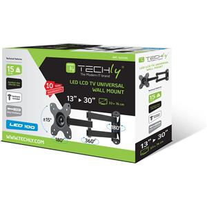 Techly Supporto a muro per TV LED LCD 13-30'' Inclinabile 3 Snodi Nero - VESA 75x75 e 100x100 mm, Max 15 kg, Inclinazione /-15°, Orientamento 180°