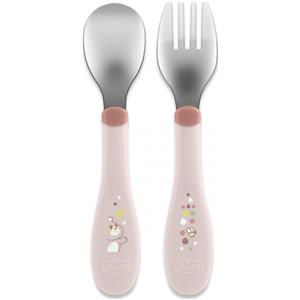 Chicco Posatine Inox 18M Rosa - Set di Posate per Bambini in Acciaio Inossidabile, Forchetta e Cucchiaio, Facili da Impugnare, 2 Pezzi