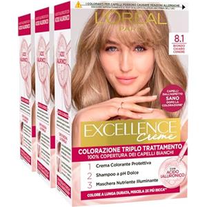 L'Oreal Paris L'Oréal Paris Tinta Permanente Excellence Creme 8.1 Biondo Chiaro Cenere Colorazione Triplo Trattamento Copre 100% dei Capelli Bianchi Lunga Durata con Acido Ialuronico - 3 Tinte