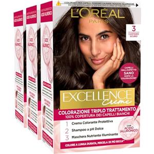 L'Oreal Paris L'Oréal Paris Tinta Permanente Excellence Creme 3 Castano Scuro Colorazione Triplo Trattamento Copre 100% dei Capelli Bianchi Lunga Durata con Acido Ialuronico - 3 Tinte