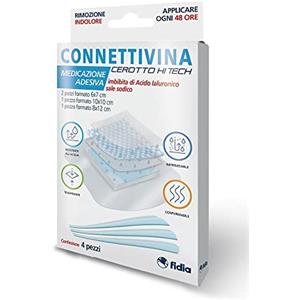 FIDIA FARMACEUTICI SPA Connettivina Cerotto Hi Tech Medicazione Adesiva con Acido Ialuronico Confezione da 4 Pezzi 2pz 6x7cm, 1pz 10x10cm, 1pz 8x12cm