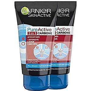 Garnier Pure Active Intense 3 in 1 Maschera Viso Punti Neri, Gel Detergente e Scrub Viso con Carbone Vegetale, 150 ml, Confezione da 2 Pezzi