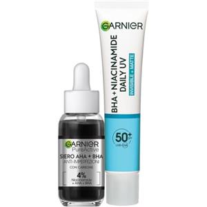 Garnier Kit Pure Active con Siero AHA + BHA Anti-Imperfezioni, e Fluido Quotidiano Anti-UV Anti-Imperfezioni con Niacinamide, con SPF 50+, Pelle Perfetta e Protetta dal sole, 30 ml + 40 ml