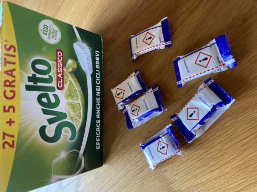 Ero molto preoccupata perché il detersivo in polvere della Finish non si trovava più in commercio. Avevo provato alcuni detersivi liquidi ma con poco risultato poi mi sono convertita alle pastiglie: l’unica pastiglia che non aveva il brillantante era quella della svelto che con qualche perplessità ho provato. Mi sono completamente ricreduta un pulito impeccabile anche a temperature non elevate, senza odori senza residui veramente soddisfatta. Consiglio il prodotto anche in virtù del prezzo decisamente più economico rispetto alle altre pastiglie.