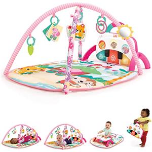 Bright Starts Groovin' Kicks 4 in 1 - Tappetino da gioco con pianoforte, tamburo e motivo floreale, include 2 barrette giocattolo per neonati