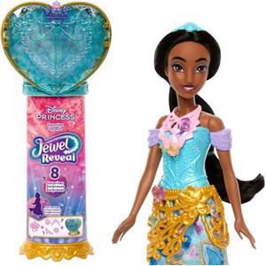 Mattel Disney Princess - Jasmine Jewel Reveal, bambola alla moda ispirata al film con 9 accessori a sorpresa, anello indossabile e portagioie a forma di cuore inclusi, 3+ anni, JLK30
