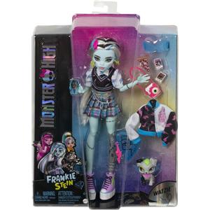 Monster High - Frankie, bambola snodata alla moda, dai capelli con ciocche blu e nere, con accessori e cucciolo, Giocattolo per Bambini 4+ Anni, HHK53, Blu