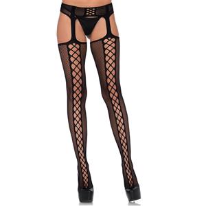 Leg Avenue Calze a Rete con Reggicalze Nero - Taglia Unica, Design con Lacci e Comfort Morbido