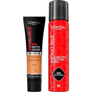 L'Oreal Paris L'Oréal Paris Infaillible Fondotinta Liquido 32H Matte Cover 4% Niacinamide SPF 25 Colore 310 Warm Undertone + Spray Fissante 3-Second Setting Mist per Trucco Viso No-Transfer 75ml - 2 Flaconi