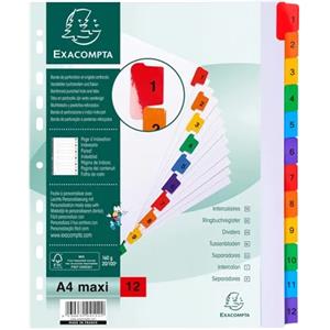 Exacompta 4112E Divisori Numerici A4 Maxi in Cartoncino Bianco 160g - 12 Schede con Tasti Colorati e Indice Stampabile