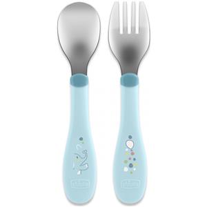 Chicco Posatine Inox 18M Azzurro - Set di Posate per Bambini in Acciaio Inossidabile, Forchetta e Cucchiaio Facili da Impugnare